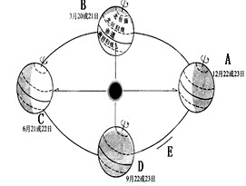 [问答题] 读“地球公转示意图”,完成下列问题.(1)在图恰当位置画出地球公转方向.(2)当地球公转到D处时,北半球正值______(冬至、夏至)日;地球公转到______(填字母)处时,北京白昼时间最长.(3)太阳直射赤道时,地球可能公转到______(填字母)处.