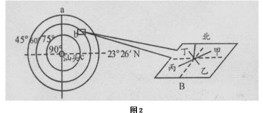 [单选题,案例分析题] 图2为汕头周边地区太阳高度的等值线图航行在b处海面的轮船上,悬挂着一面国旗,此刻旗杆影子的方向为()A .甲B . 乙C . 丙D . 丁