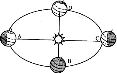 [问答题] 读地球公转示意图,回答下列问题.(1)请在图中地球公转轨道上用箭头标出地球的公转方向.(2)当地球公转到A点时,日期是每年的______前后.(3)当地球公转到C点时,我们资阳市的昼夜长短情况是______.(4)当地球公转到D点时,太阳直射点的纬度是______.