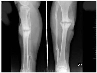 [单选题]48岁女性患者,因车祸致右胫腓骨骨折,行外固定术后两年复查,如图所示,最可能的诊断是()A.右胫骨愈合延迟B.右胫骨假关节形成C.右胫骨骨折愈合好,有
