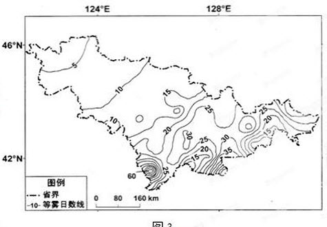 雾是悬浮于近地面空气中的大量水滴或冰晶,使水平能见度小于1Km的物理现象,读我国某省多年平均年雾日数分布图(图3)