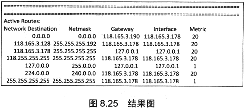 在host1的DOS命令窗口中,运行routeprint命令显示其路由信息,得到的结果如图8.25所示。