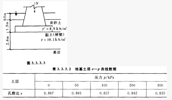 某桥墩基础底面尺寸为4m×8m,正常使用极限状态下,相应于作用的长期效应组合时,作用于基底的中心荷载N=8000kN(已包括基础重力及水的浮力),基础埋深1.5m,地基土层情况如图3.3.3.3所示,地基土层室内压缩试验成果见表3.3.3.2.如果沉降计算的经验系数M取0.4,则基础中心的沉降量为()cm。()