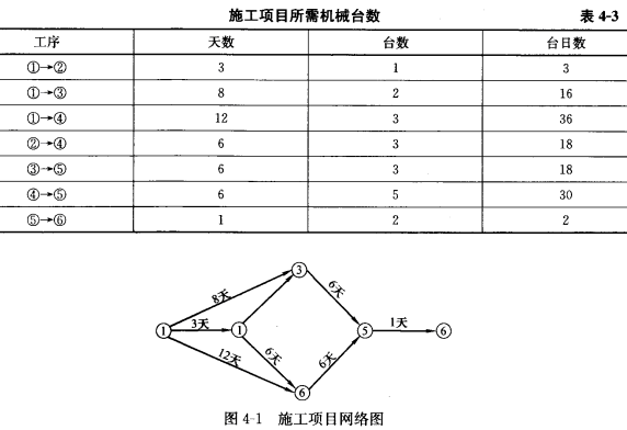某机械施工项目的网络图和所需机械台数如表4-3和图4-1所示。请回答以下相关问题,以使投入的机械台数最少又能最均匀施工。