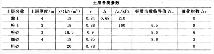 有一建筑无浅基础,宽为2.5m,埋深1.5m,地下水位深1.5m,土的各类参数见下表,作用在基础顶面竖向荷载F=600kN,其按抗震要求为乙类建筑,试回答以下问题: