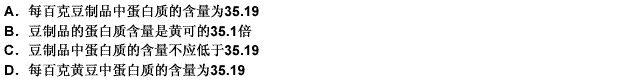 [单选题]在进行膳食调查结果的计算和分析时,需将豆类食物的摄入量折算成黄豆的量,计算公式为:黄豆量=豆制品摄入量×蛋白质含量÷35.1,其中35.1代表()。A