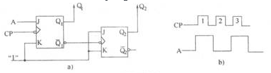 由两个主从型JK触发器组成的逻辑电路如图a)所示,设Q1、Q2的初始态是0,0,已知输入信号A和脉冲信号(,的波形,如图b)所示,当第二个CP脉冲作用后,Q1、Q2将变为()