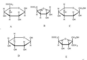 上述化合物中(1)哪个是半缩酮形式的酮糖?(2)哪个是吡喃戊糖?(3)哪个是糖苷?(4)哪个是α-D-醛糖?