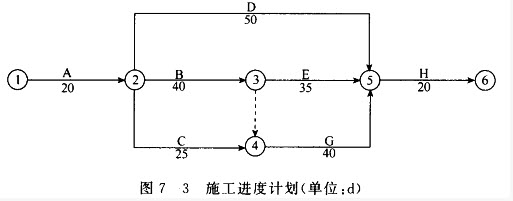 某建设单位和施工单位按照《建设工程施工合同(示范文本)》签订了施工合同,合同中约定:建筑材料由建设单位提供;由于非施工单位原因造成的停工,机械补偿费为200元/台班,人工补偿费为50元/工日;总工期为120d;竣工时间提前奖励为3000元/d,误期损失赔偿费为5000元/d。经项目监理机构批准的施工进度计划如图7-3所示(单位:d)。