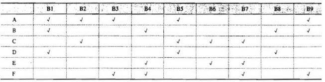 [单选题] 某学院10名博士生(B1-B10)选修6门课程(A-F)的情况如下表(用√表示选修):现需要安排这6门课程的考试,要求是:1)每天上、下午各安排一门课程考试,计划连续3天考完;2)每个博士生每天只能参加一门课程考试,在这3天内考完全部选修课;3)在遵循上述两条的基础上,各课程的考试时间应尽量按字母升序做先后顺序安排(字母升序意味着课程难度逐步增加)。 为此,各门课程考试的安排顺序应是(68) 。(68)A. AE,BD,CFB. AC,BF,DEC. AF,BC,DED. AE,BC,DF