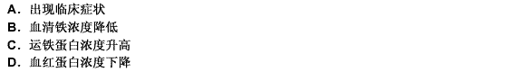 [单选题]体内缺铁处于缺铁性贫血期时表现为( )。A.血清铁浓度升高B.血红蛋白浓度下降C.运铁蛋白浓度升高D.出现临床症状