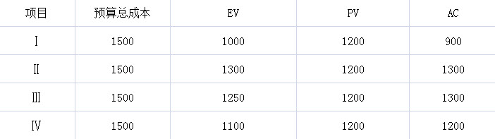 [单选题] 项目Ⅰ、Ⅱ、Ⅲ、Ⅳ的工期都是三年,在第二年末其挣值分析数据如下表所示,按照趋势最早完工的应是项目(57) 。(57)A. Ⅰ B. Ⅱ C. Ⅲ D. Ⅳ
