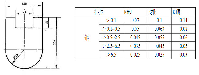 计算题:计算下图所示零件的冲材力。材料为Q235钢,τ=345MPa,材料厚度t=1mm,采用刚性卸料装置和下出料方式,凹模刃口直壁高度h=6mm。