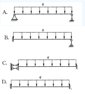 下列各项中,梁所采用材料、截面均相同,在受相同的均布荷载作用下,其中挠度最小的是()。