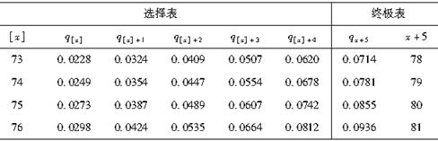 [单选题]现年76岁的李某在3年前购买了人寿保险,已知选择-终级生命表如表所示,则李某活过80岁的概率为( )。表 选择—终极生命表A.0.3857B.0.4