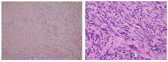 [单选题]患者男,3岁,因“腹痛”来诊。剖腹探查:肠系膜上有一肿块,累及小肠。镜下形态如图所示。最可能的诊断是A.炎性纤维性息肉B.炎性肌成纤维细胞瘤C.胃肠道