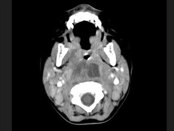 [多选题] 10个月大的婴儿,发热,曾患中耳炎,CT扫描如图所示,请选择正确的描述或诊断()A .咽后壁软组织肿胀B .其内密度不均C .颈椎骨质未见明显异常D .考虑为咽后壁脓肿E .考虑为咽后壁寒性脓肿