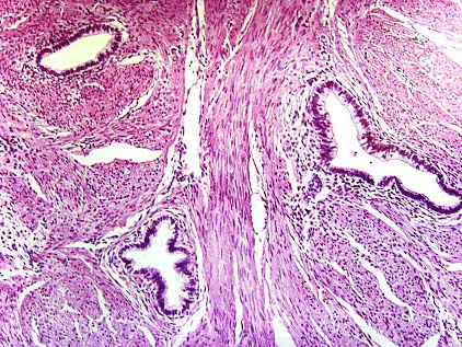 [单选题]女性,32岁,阴道不规则出血。检查宫颈肥大伴糜烂,细胞涂片(-)。巨检及镜下如图所示:位于宫颈壁深层8mm处见分化好的、外形扭曲的腺体,无间质反应。结