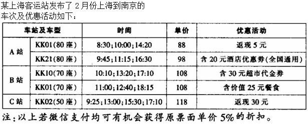 [单选题]张某要到南京出差,11点半吃完午饭,赶往A站需要半小时、B站40分钟、C站50分钟.既能保证尽早到达也要更为优惠(他手机未开通微信支付功能),他应选择
