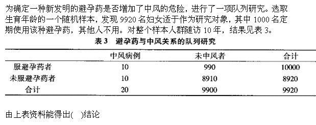 A.使用该药确实增加了中风危险。下述事实表明了这种危险的程度;中风病例中50%(10/20)使用该药,而未中风病例中10%(990/9900)使用该药