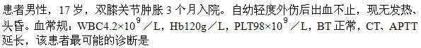 [单选题]A.风湿性关节炎B.白血病C.特发性血小板减少性紫癜D.血友病E.过敏性紫癜