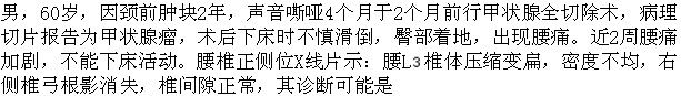[单选题]A.腰椎间盘突出症B.腰椎结核C.腰椎骨髓炎D.椎体棘球蚴病E.转移性骨肿瘤