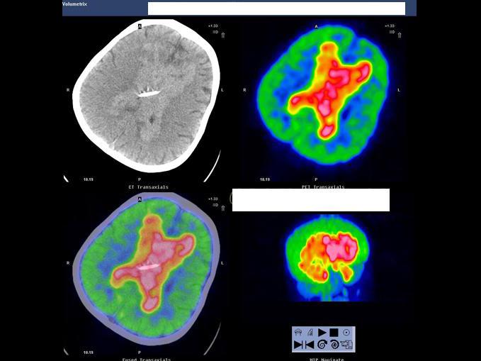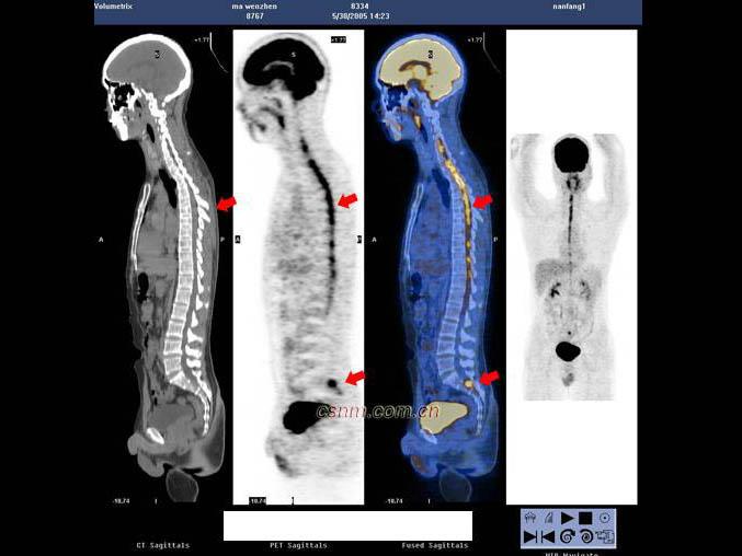 [多选题] 男,7岁,2岁时因头痛而就诊,MRI示脑积水、颅内(小脑蚓部及蝶鞍)见多发恶性肿瘤,临床诊断为髓母细胞瘤。未行手术治疗,多年来一直行放、化疗治疗,最后一次化疗1个月前结束。因腹胀、恶心、呕吐1周而就诊,CT示:双侧侧脑室充满肿瘤病灶,PET/CT全身显像如图。正确的描述是()。A . 肿瘤复发并沿双侧侧脑室弥漫性浸润B . 肿瘤同时向双侧丘脑及豆状核浸润、侵犯;蝶鞍内块状高代谢病灶,考虑为转移灶C . 脑干及颈段、胸段、上腰段脊髓内见长条状高代谢病灶,考虑为肿瘤向脑干及大部分脊髓播散、种植转移