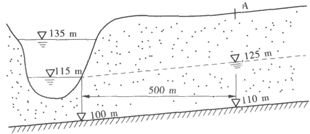 [单选题]如图所示,某水库蓄水前河水位为115m,水库设计正常蓄水位为135m。水库右岸一段库岸由均质的弱透水地层组成,透水层的底板倾向河谷。在距岸边500m处的A剖面上,透水层底板高程为l10m,水库蓄水前地下水位为125m。河水边透水层底板高程为100m。不考虑地表人渗量,水库蓄水后A剖面处的地下水位高程约为()m。A . 135B . 140C . 145D . 150