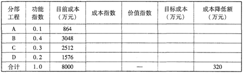 3.假定A、B、C、D四个分部分项工程的目前成本分别为864万元、3048万元、2515万元和1576万元,目标成本降低总额为320万元,试计算各分部工程的目标成本及其可能降低的额度,并确定各分部工程功能的改建顺序。(将计算结果填入表2.1中,成本指数和价值指数的计算结果保留三位小数)