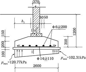 [单选题]某承重墙下条形基础,底宽2.6m,埋深2m,板高0.35m,如图5-20所示,已知上部结构传来荷载设计值F=290kN/m,M=10.4kN·m。采用