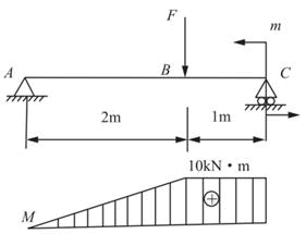 [单选题]悬臂梁的弯矩如图示,根据弯矩图推得梁上的载荷应为(  )。题64图A.F=10kN,m=10kN·mB.F=5kN,m=10kN·mC.F=10kN,