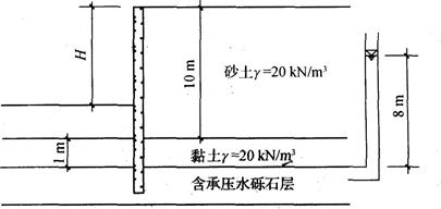[单选题]某建筑基坑采用地下连续墙支护,土层分布情况如图所示,砂土和黏土的天然重度均为2.0kN/m3。砂层厚度10m,黏土隔水层厚度2m,在黏土隔水层以下砾石层中有承压力,承压水头8m。没有采取降水措施,保证基坑抗突涌稳定安全系数不小于1.1。按《建筑基坑支护技术规程》作答。试问:该基坑的最大开挖深度H(m)不能超过下列()项。()A . 5.6B . 6.6C . 7.6D . 8.6