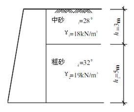 [问答题]图示既有挡土墙的原设计为墙背直立、光滑,墙后的填料为中砂和粗砂,厚度分别为h1=3m和h2=5m,中砂的重度和内摩擦角分别为γ1=18kN/m3和φ1