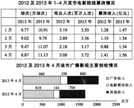 [单选题]关于2013年4月该市广播影视情况,能够从资料中推出的是:A.广告收入同比上升了近两成B.电影观众人次环比增速下降C.电影票房收入同比增速快于其他收入
