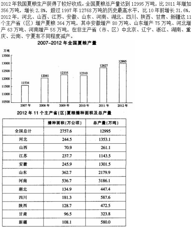 [单选题]根据上述材料,下列说法错误的是:A.2012年,11个主产省(区)夏粮增产量超过了全国增产总量B.2011年安徽夏粮产量为1221.5万吨C.与上一年