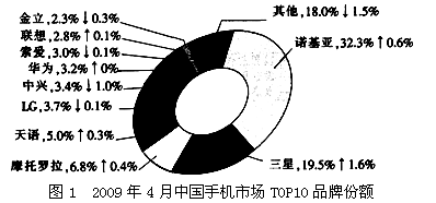 根据上图,2009年4月中国手机市场TOP10品牌份额的比重为( )。