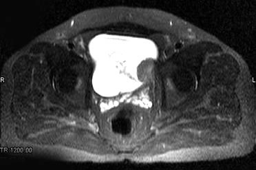 [单选题]男,59岁,血尿1月,MRI检查如图所示。最可能的诊断是()A.膀胱内血块B.膀胱癌C.膀胱结石D.膀胱息肉E.输尿管囊肿