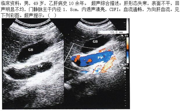 [单选题]A.正常门静脉声像图B.肝硬化门静脉血栓C.肝癌门静脉癌栓D.肝硬化门静脉增宽