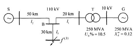 处发生三相短路,各线路电抗均为0.4Ω/km,长度标在图中,系统电抗未知,发电机、变压器参数标在图中,取
