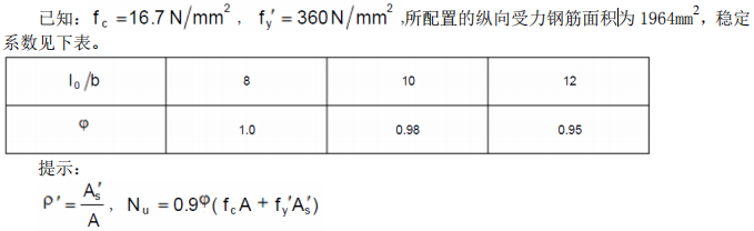 [问答题]某现浇底层钢筋混凝土轴心受压柱,截面尺寸b×h=300mm×300mm,采用4φ20的HRB335级钢筋(f′y=300N/mm2),混凝土C25(f