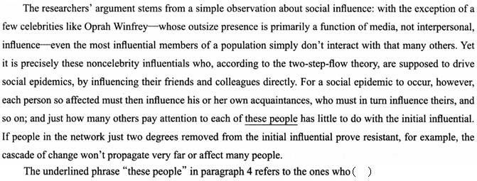 [单选题]A.stay outside the network of social influenceB.have little contact with th