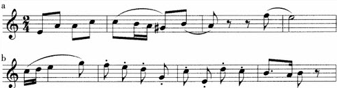 (1)用下列谱例中a.b两个乐句和自己创编的两个乐句构成四个乐句乐段。
