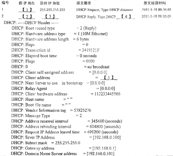 某公司网络管理员使用DHCP服务器对公司内部主机的IP地址进行管理。在某DHCP客户机上执行“ipconfig/all”得到的部分信息如网1所示,在该客户机捕获的部分报文及相关分析如图3所示。请分析图中的信息,补全图2中【1】到【5】的内容。