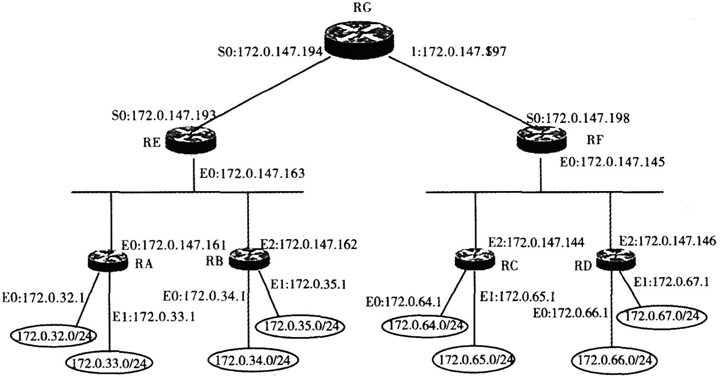 2.如果需要监听路由器RE和RG设备之间的所有流量,可以在该链路中串入一种设备。请写出这种设备的名称。(2分)