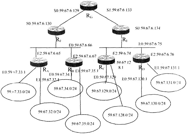 [问答题]请根据下图所示网络结构回答下列问题。图 网络结构示意图(1)填写路由器RG的路由表项【1】~【4】。 (2)请写出路由器RG和路由器RE的S0口的I