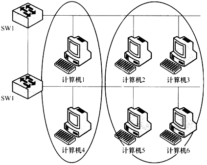 说明:利用VLAN技术可以把物理上连接的网络从逻辑上划分为多个不同的虚拟子网,可以对各个子网实施不同的管理策略。图12-4标示两个交换机相连,把6台计算机配置成两个VLAN。