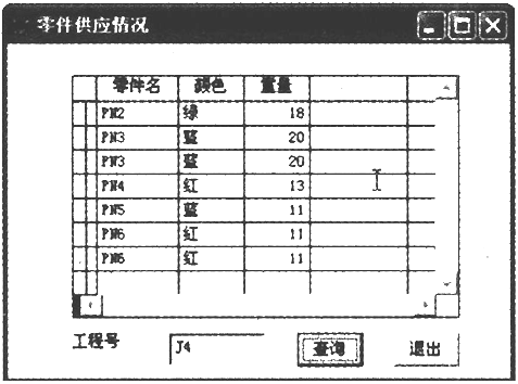表单标题为“零件供应情况”,表格控件为Grid1,命令按钮“查询”为Command1、“退出”为 Command2,标签控件Label1和文本框控件Text1(程序运行时用于输入工程号)。