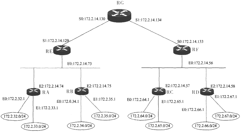 [试题]请写出路由器RG和路由器RE的SO口的IP地址。(2分)