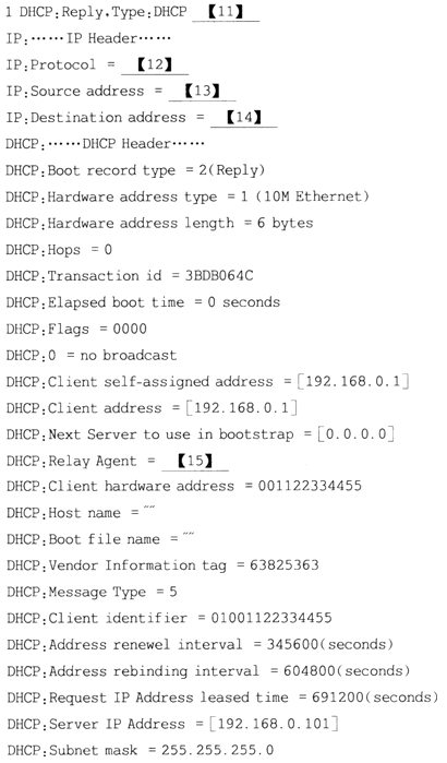 [试题]某公司网络管理员使用DHCP服务器对公司内部主机的IP地址进行管理。在某DHCP客户机上执行“ip config/all”得到的部分信息如图2所示,在该客户机捕获的部分报文及相关分析如图3所示。请分析图中的信息,补全图3中(11)到(15)的内容。图2 在DHCP客户机执行ipconfig/all获取的部分信息图3 在DHCP客户机上捕获的报文及第2条报文的分析