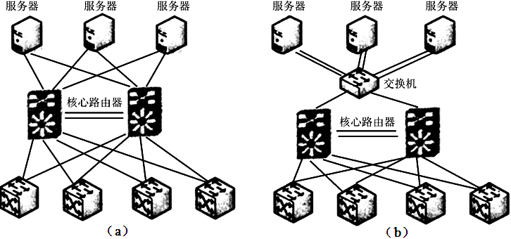 A.两个核心路由器之间采取冗余链路的光纤连接